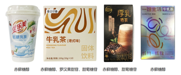 木糖醇、赤藓糖醇、麦芽糖醇是瓶装即饮奶茶常用的甜味剂。糖醇替代奶茶中的蔗糖不会影响产品的稳定性,能维持奶茶的色泽,让口感饱满醇厚。